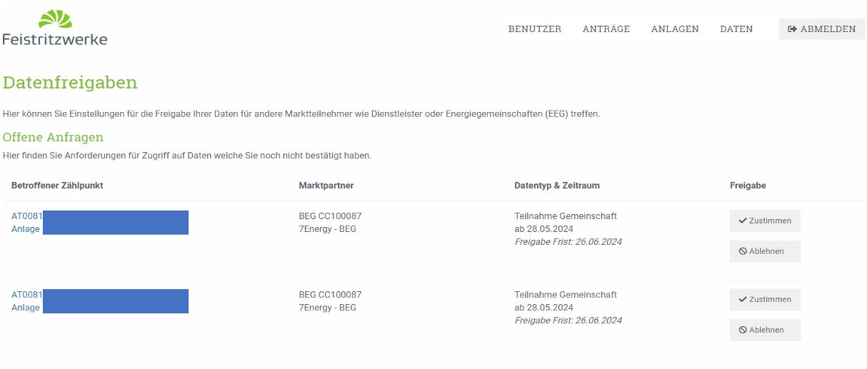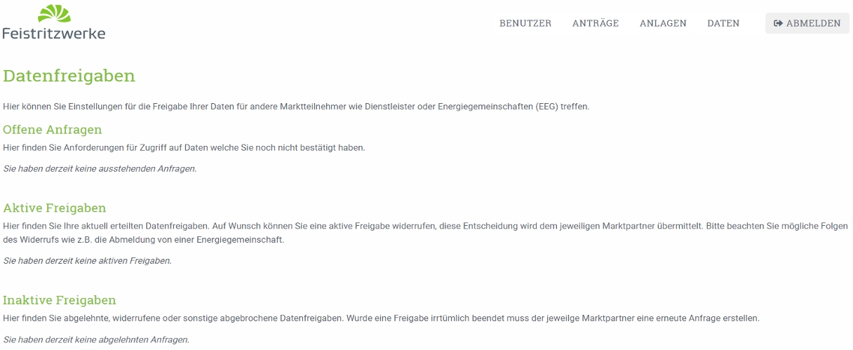 Die Feistritzwerke STEWEAG betreiben ein Kundenportal. Die Zustimmung zur Datenfreigabe erfolgt dort online, jedoch nur, wenn die jeweilige Anlage zuvor im Kundenportal hinzugefügt wurde.