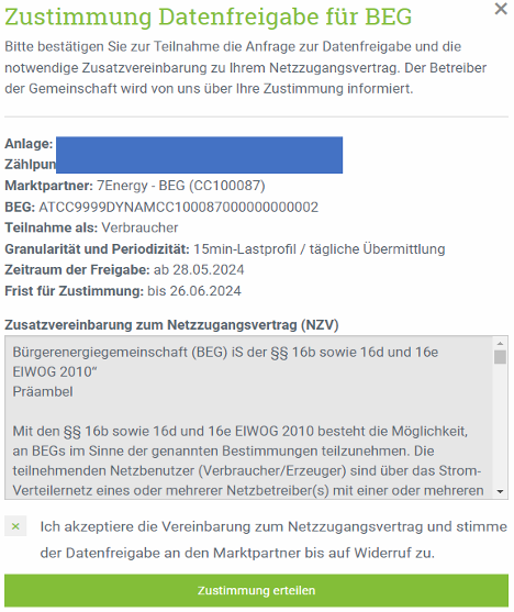 Die 7Energy - BEG oder EEG Salzburg RID-Nr. erhält einerseits im Hintergrund eine Meldung vom Netzbetreiber, dass die Datenfreigabe erteilt wurde und andererseits muss nun der Netzbetreiber noch die Abschlussmeldung schicken. Bei den Feistritzwerken kann das auch durchaus 14 Tage dauern. Erst danach wird dein Zählpunkt aktiv in unserer Energiegemeinschaft.