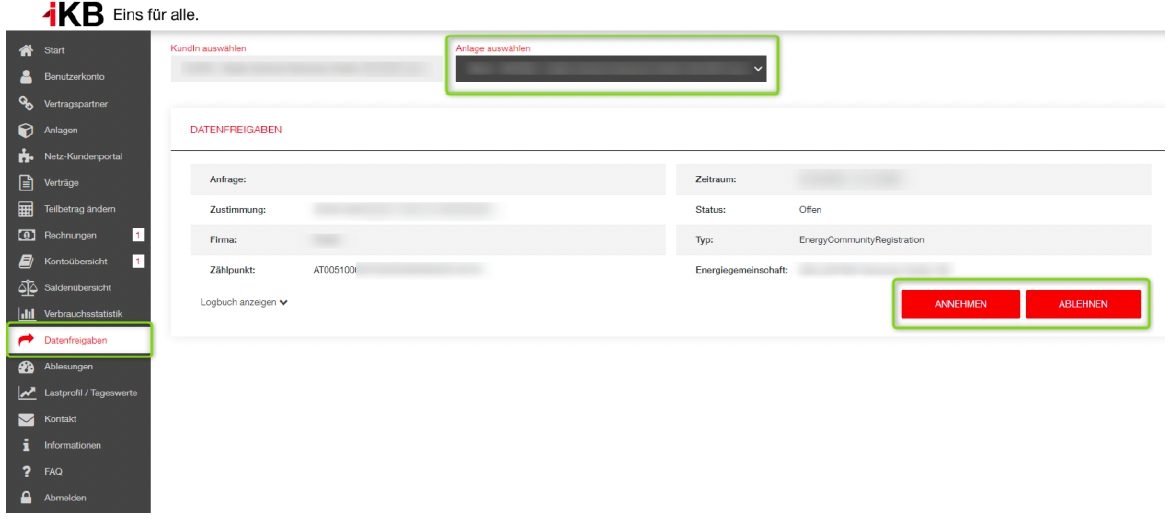 Im Kundenportal der IKB wird dann ein weiterer Menüpunkt "Datenfreigabe" angezeigt und hier kannst du nach der Auswahl der richtigen Anlage(n) die Datenfreigabe(n) "Annehmen".