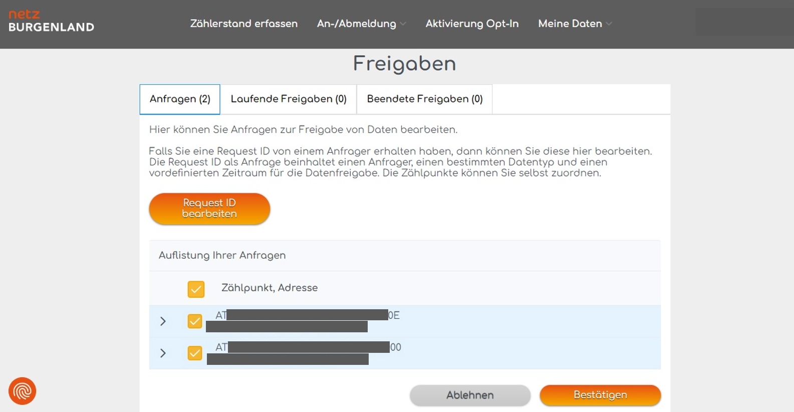 Du musst die Datenfreigaben der 7Energy - BEG selektieren und auf den "Bestätigen" Button drücken.