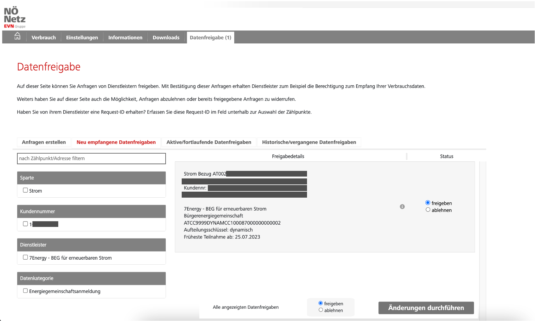 Wenn von 7Energy BEG eine Datenfreigabe beantragt ist, diese bitte "freigeben" und dann "Änderungen durchführen" drücken.&#x20;