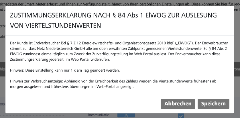 <figure><img src="https://content.gitbook.com/content/JdMxzpg6l4YovI5swM1x/blobs/XwcEvvaY8mZSeec3lTHo/Screenshot%202023-07-14%20at%2014.35.44.png" alt=""><figcaption><p>Zustimmungserklärung zur Auslesung von 1/4-Stunden-Werten.</p></figcaption></figure>