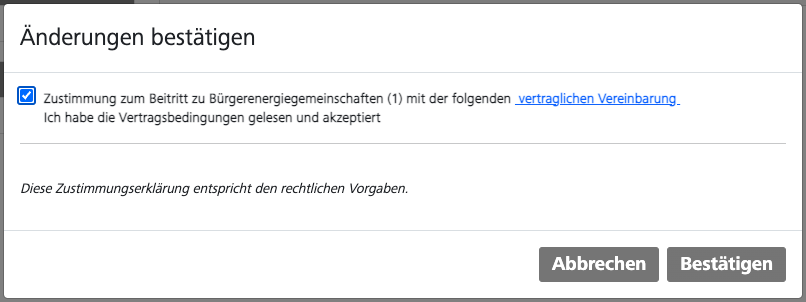 <figure><img src="https://content.gitbook.com/content/JdMxzpg6l4YovI5swM1x/blobs/x81pgB4ohyWK1oRxNa1T/image.png" alt=""><figcaption><p>Bestätigung zur Zustimmung zum Beitritt zur Bürgerenergiegemeinschaft</p></figcaption></figure>