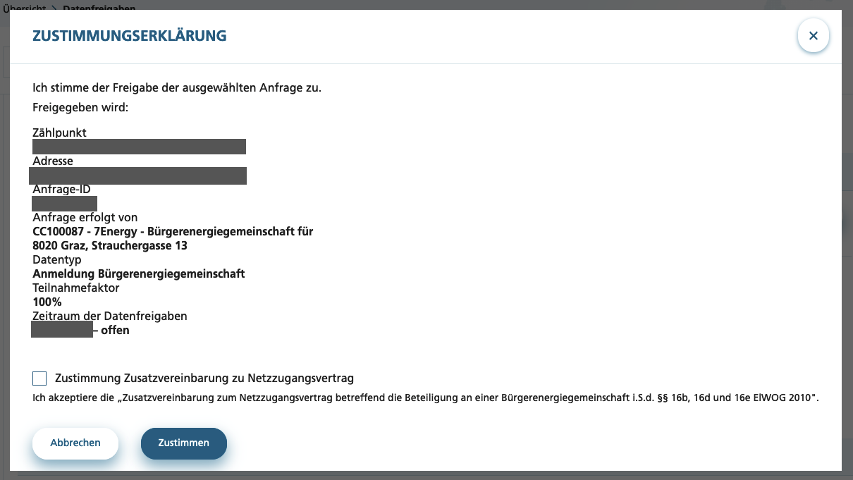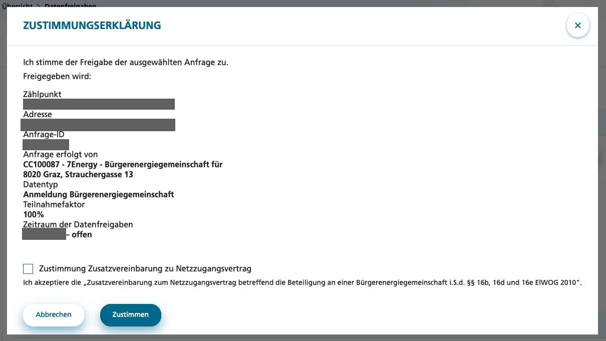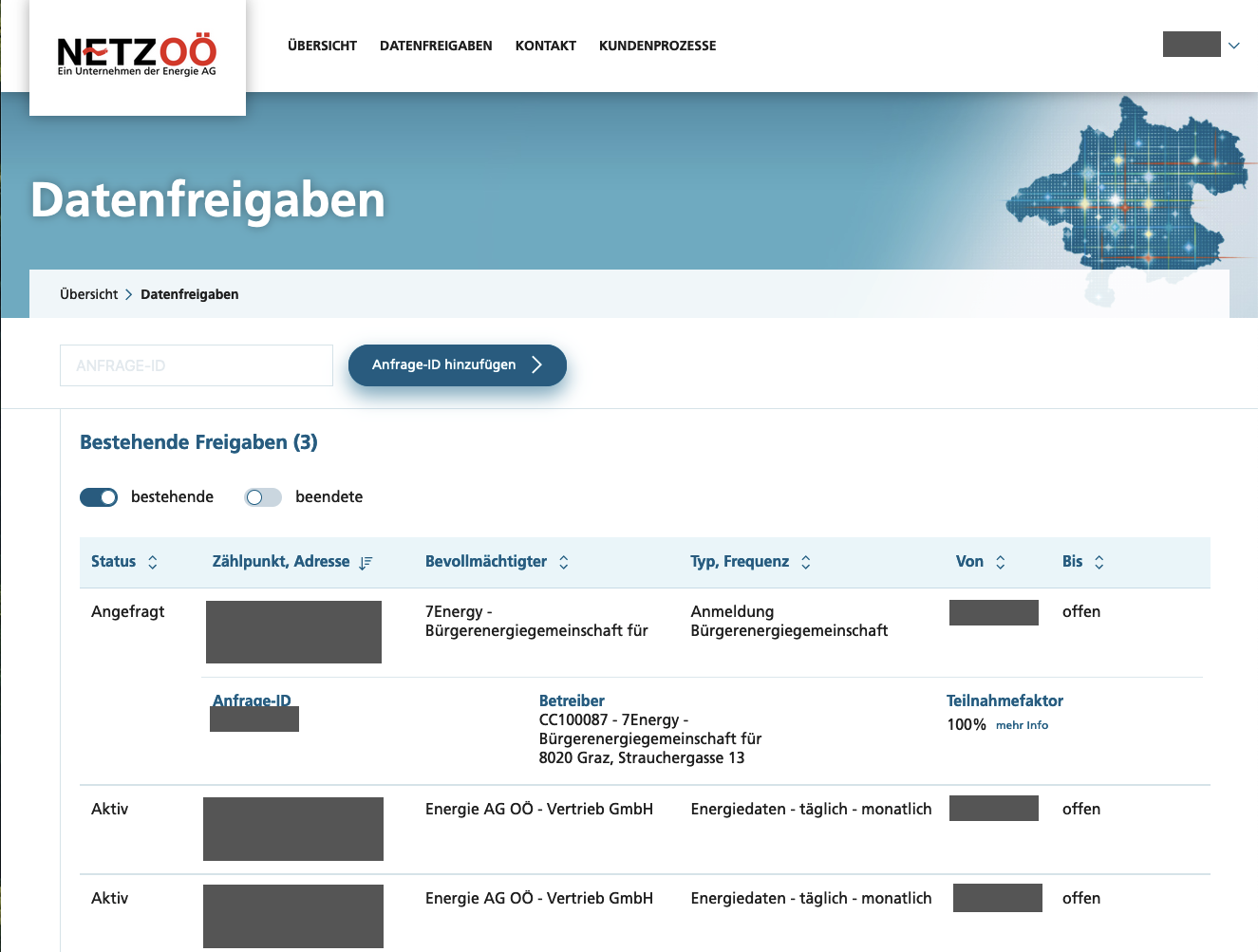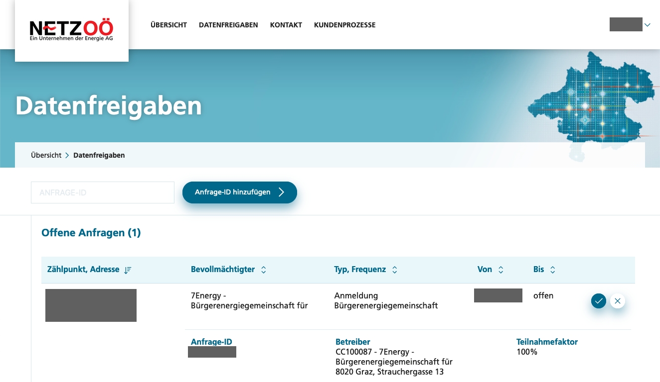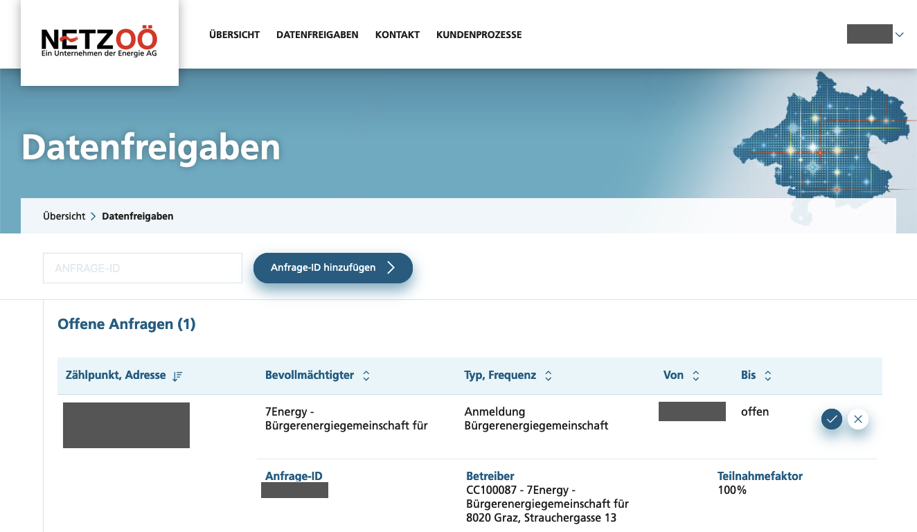 Die 7Energy - BEG oder EEG Oberösterreich RID-Nr. erhält einerseits im Hintergrund eine Meldung vom Netzbetreiber, dass die Datenfreigabe erteilt wurde und andererseits muss nun der Netzbetreiber noch die Abschlussmeldung schicken.